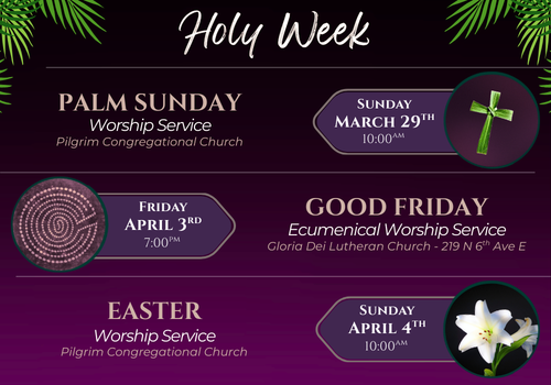 Pilgrim is a mainline, progressive, Christian church. We are rooted in Scripture, active in social concerns, and we nurture the human spirit through worship & the arts.